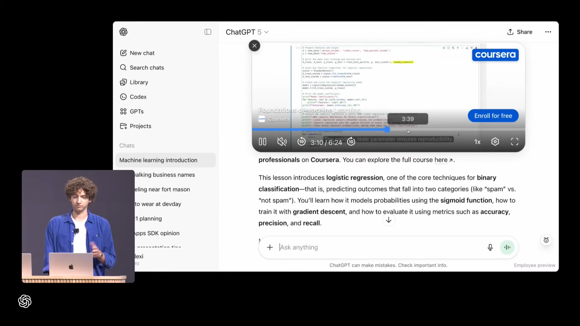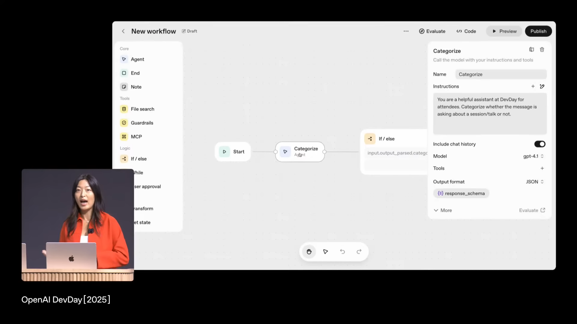 DevDay 현장에서 가장 놀라운 순간은 라이브 데모였습니다. 발표자가 컨퍼런스 웹사이트에 세션 추천 에이전트를 만들어 배포하는 데 걸린 시간이 단 8분이었습니다. 가드레일 설정(개인정보 보호), 파일 지식 연결, 커스텀 UI 위젯까지 포함해서 말입니다.
